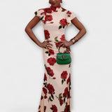 Aporta un toque de elegancia a tu guardarropa con nuestro vestido maxi de declaración. Este impresionante vestido de largo maxi, confeccionado en tela elástica, presenta un original estampado de rosas que realza cualquier ocasión.